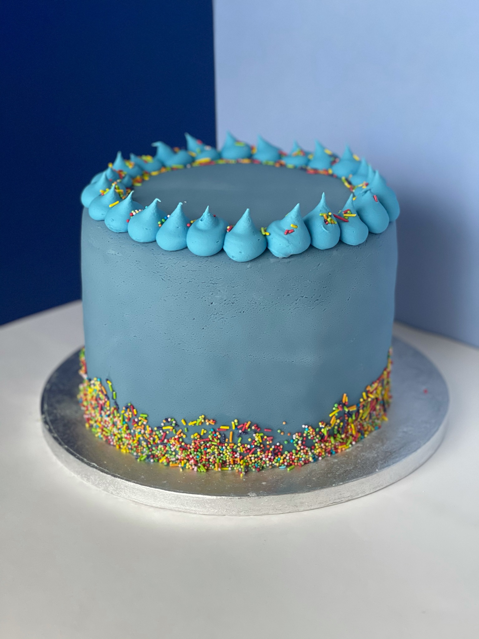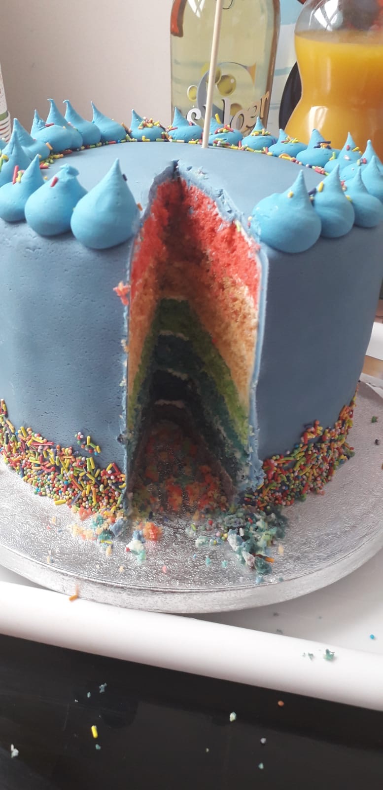 Rainbow cake with icing droplet topping and rainbow mixed sprinkle base.  Vanilla sponge with buttercream filling.